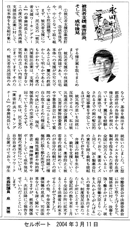 | 2004/03/11 | 被災者支援、薬害肝炎、そして、成年後見 コラム「永田町より一筆啓上」より(jpg画像) |