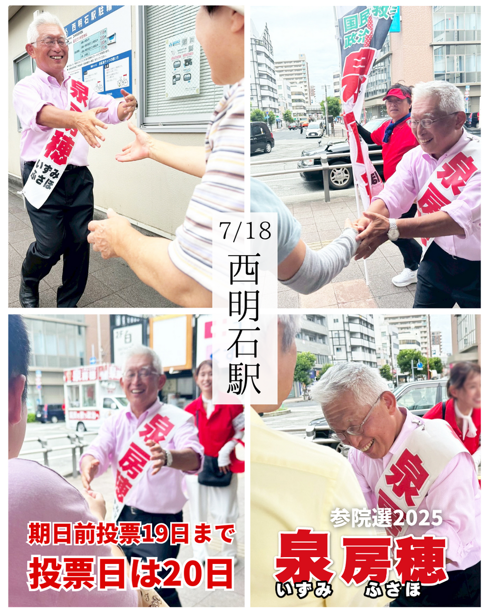 明石市長を12年間していたこともあってか、声のかけ方が他の街よりも距離感が近い。「顔、焼けてんなぁ」とか、「明石に来るん、遅いやん」とか、「元気そうで、なにより」とか、「地域の夏祭り以来です」などなど・・・
