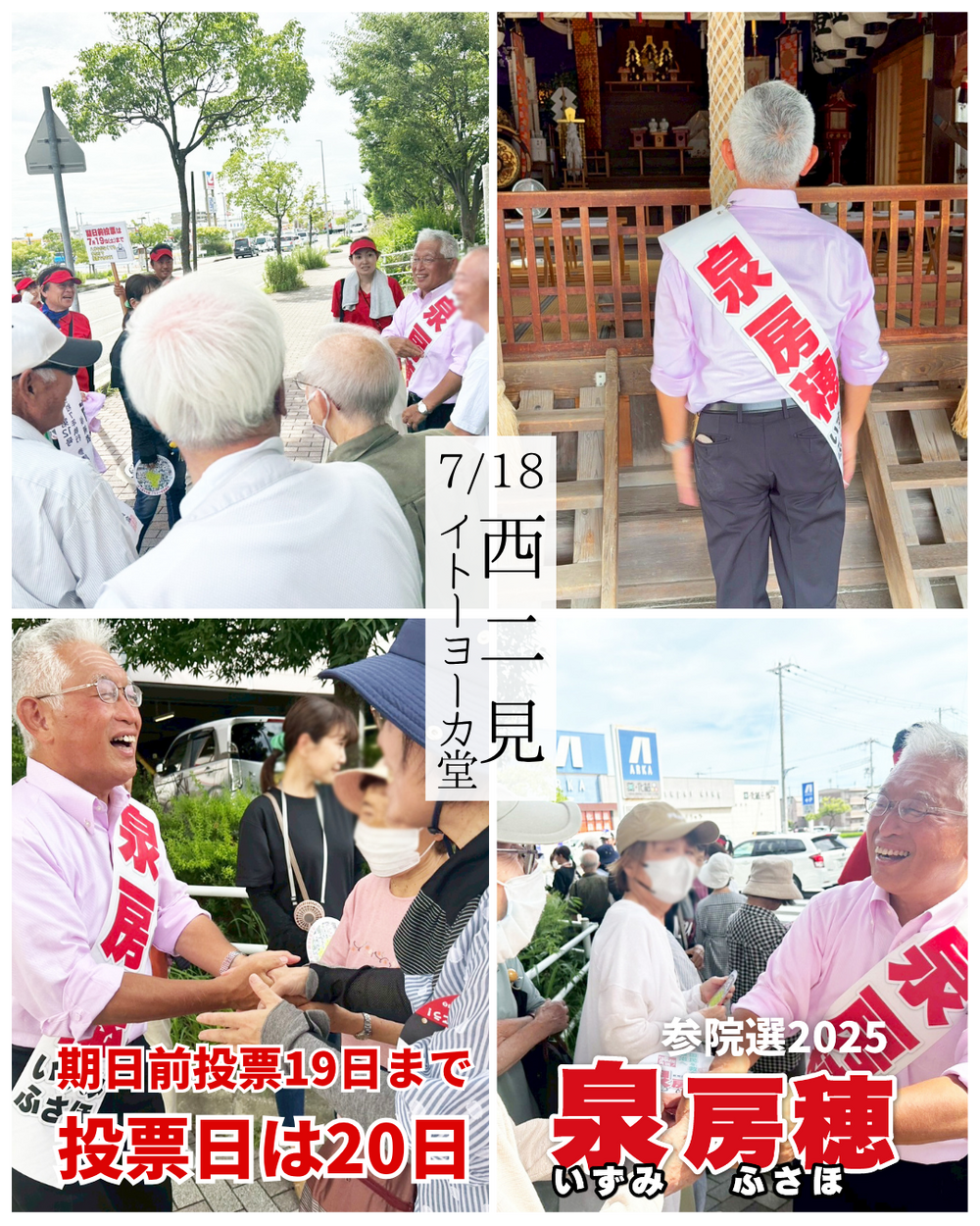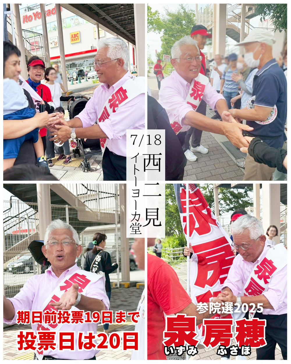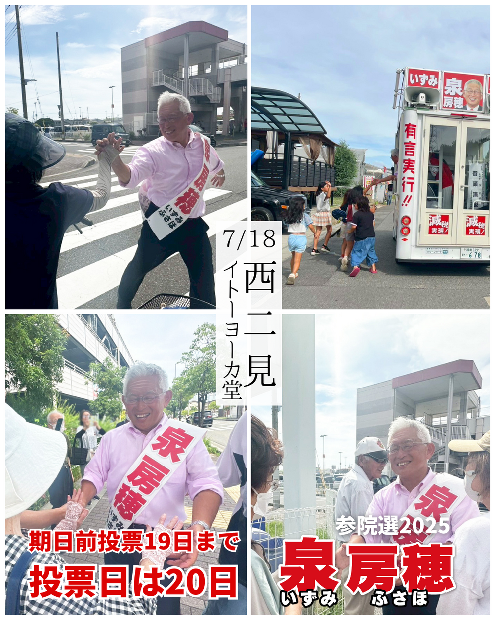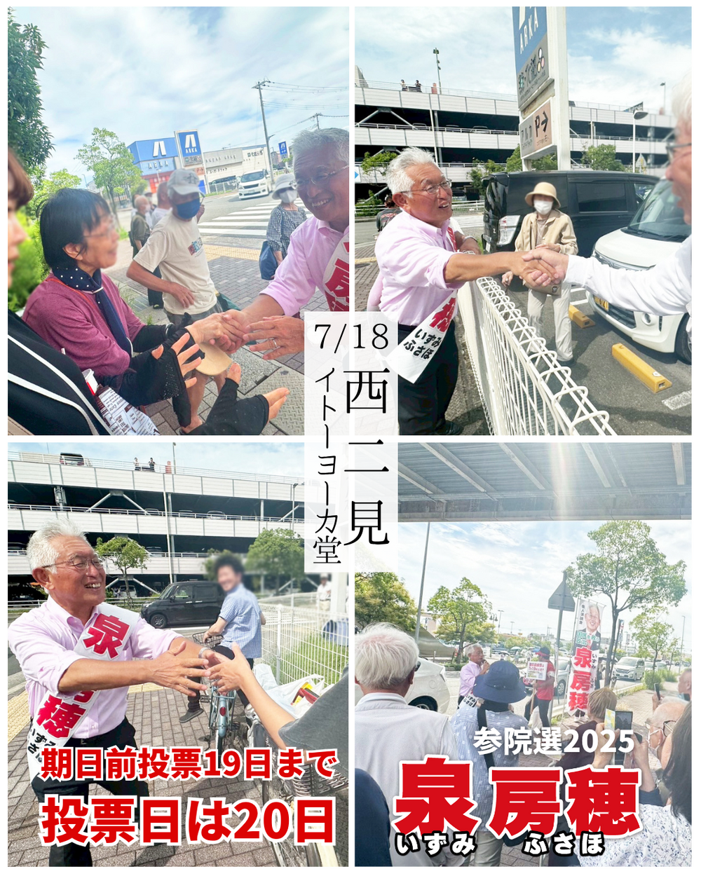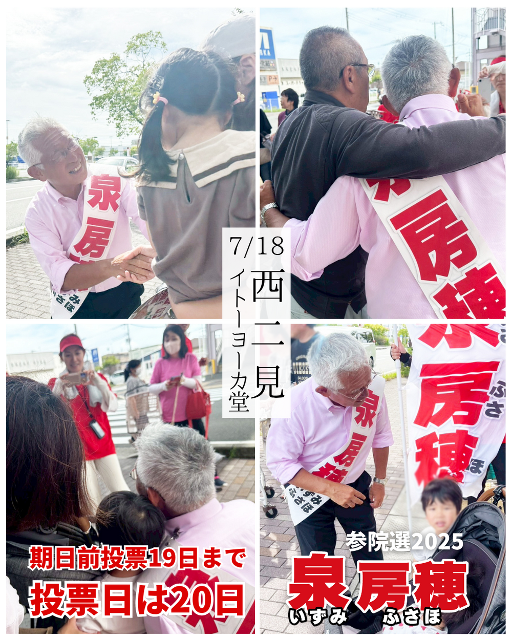 二見で演説をすると連絡を一本入れたら、口コミで伝わり、たくさんの方が集まってきてくれた。小学校時代のクラスメイトもいるし、実家の近所のオッチャンやオバチャンもいる。みんな「フサホ」とか「フサホちゃん」で、誰も「泉さん」とは言わない。「帰ってきた」って気がした・・・