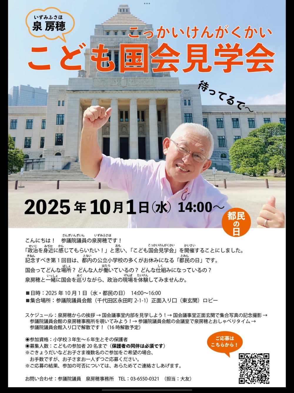 かねてから開催したいと思っていた『こども政治塾』だが、まずは『こども国会見学会』から始めたい。