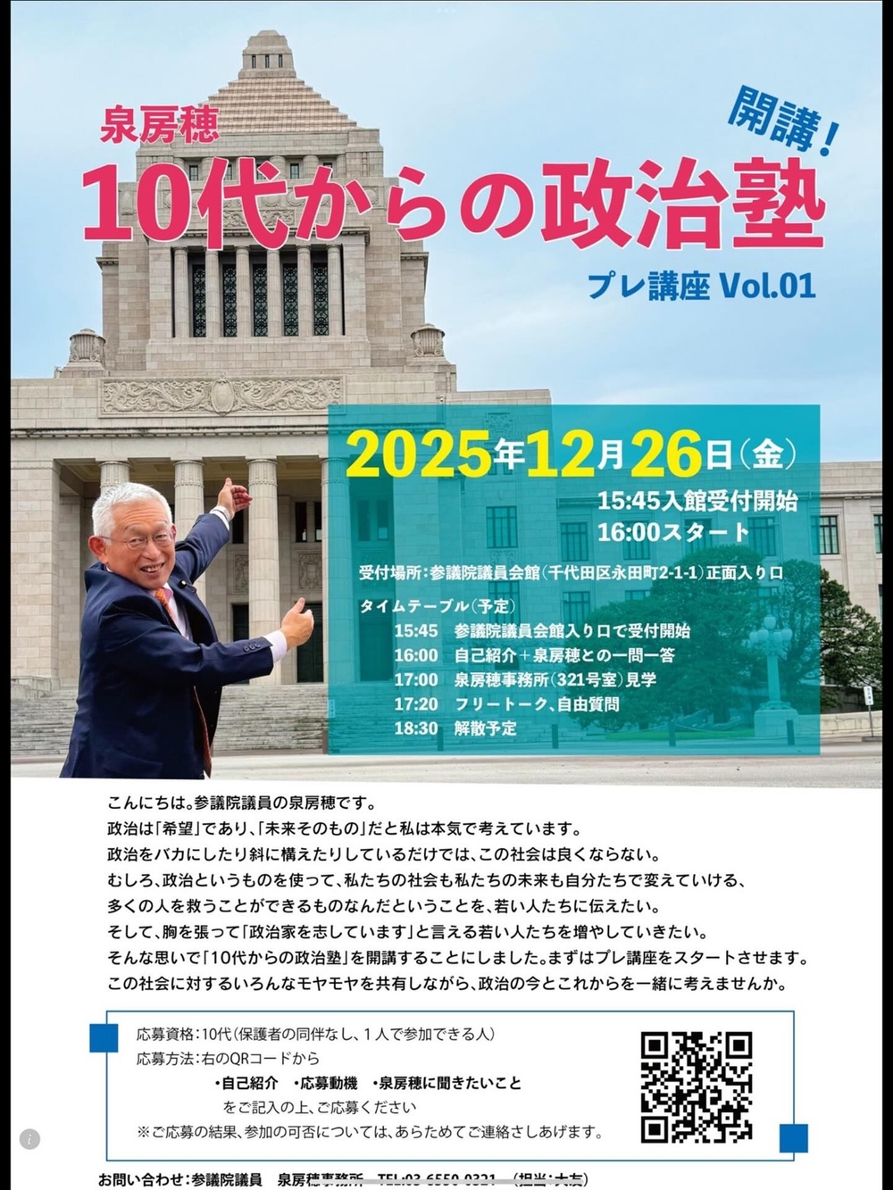 ご要望もあり、冬休み中に、政治塾の開催決定!!
